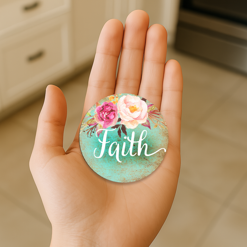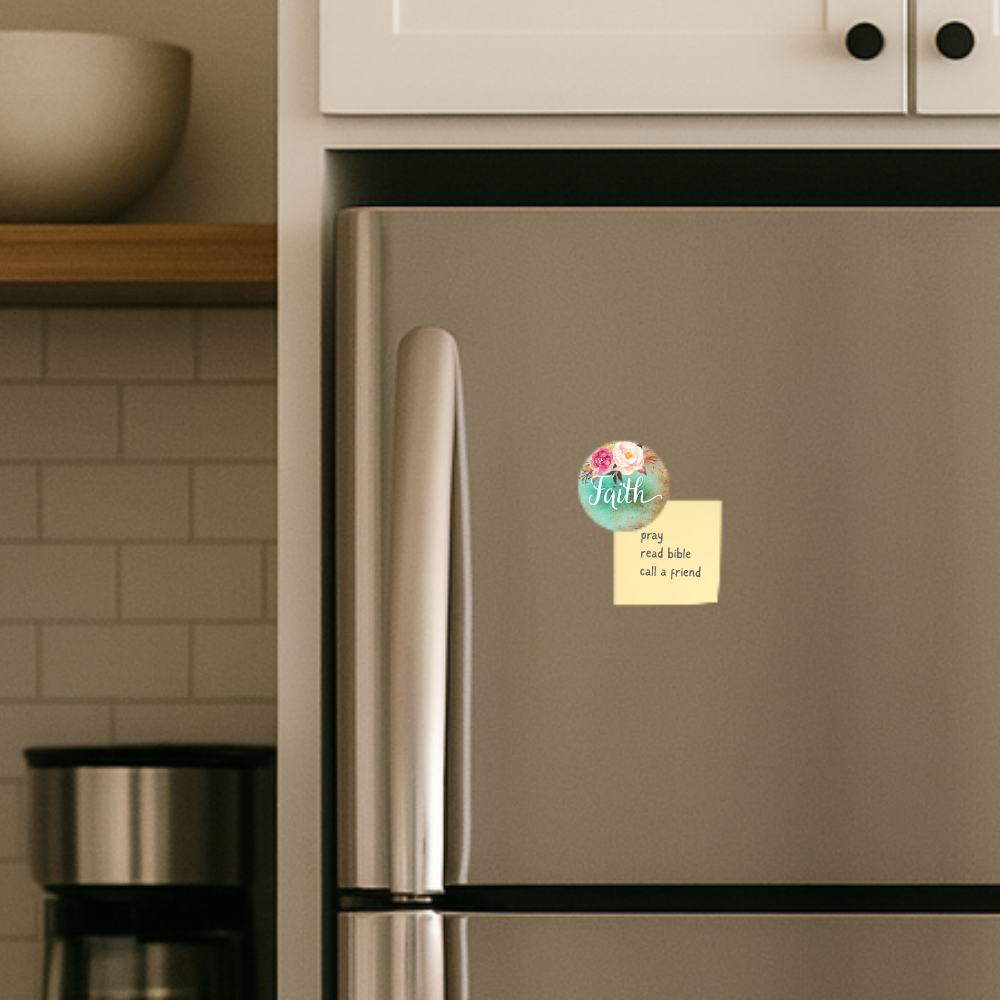 Place this daily reminder where you’ll see it most. Our floral “faith” round magnet steadies your heart and neatly holds notes, photos, and prayer cards.