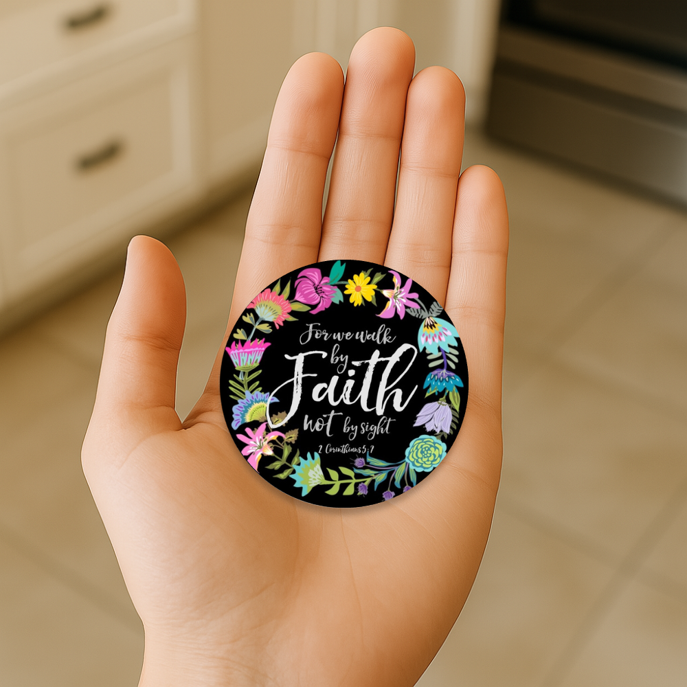 Place this daily reminder where you’ll see it most. Our floral “walk by faith” round magnet steadies your heart and neatly holds notes, photos, and prayer cards.